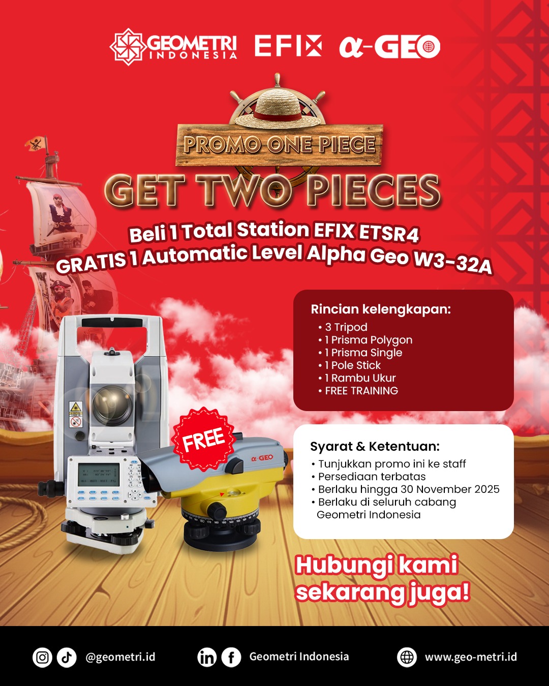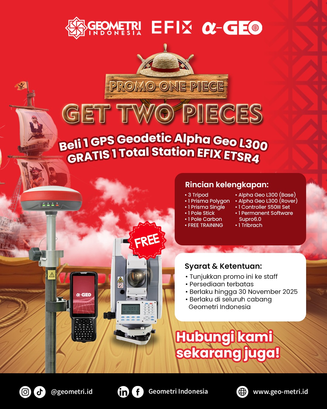 Promo bajak laut paling gokil! Beli GPS Geodetik Alpha Geo L300 set lengkap, langsung gratis Total Station EFIX ETSR4. Stok terbatas hingga 30 Nov 202...
